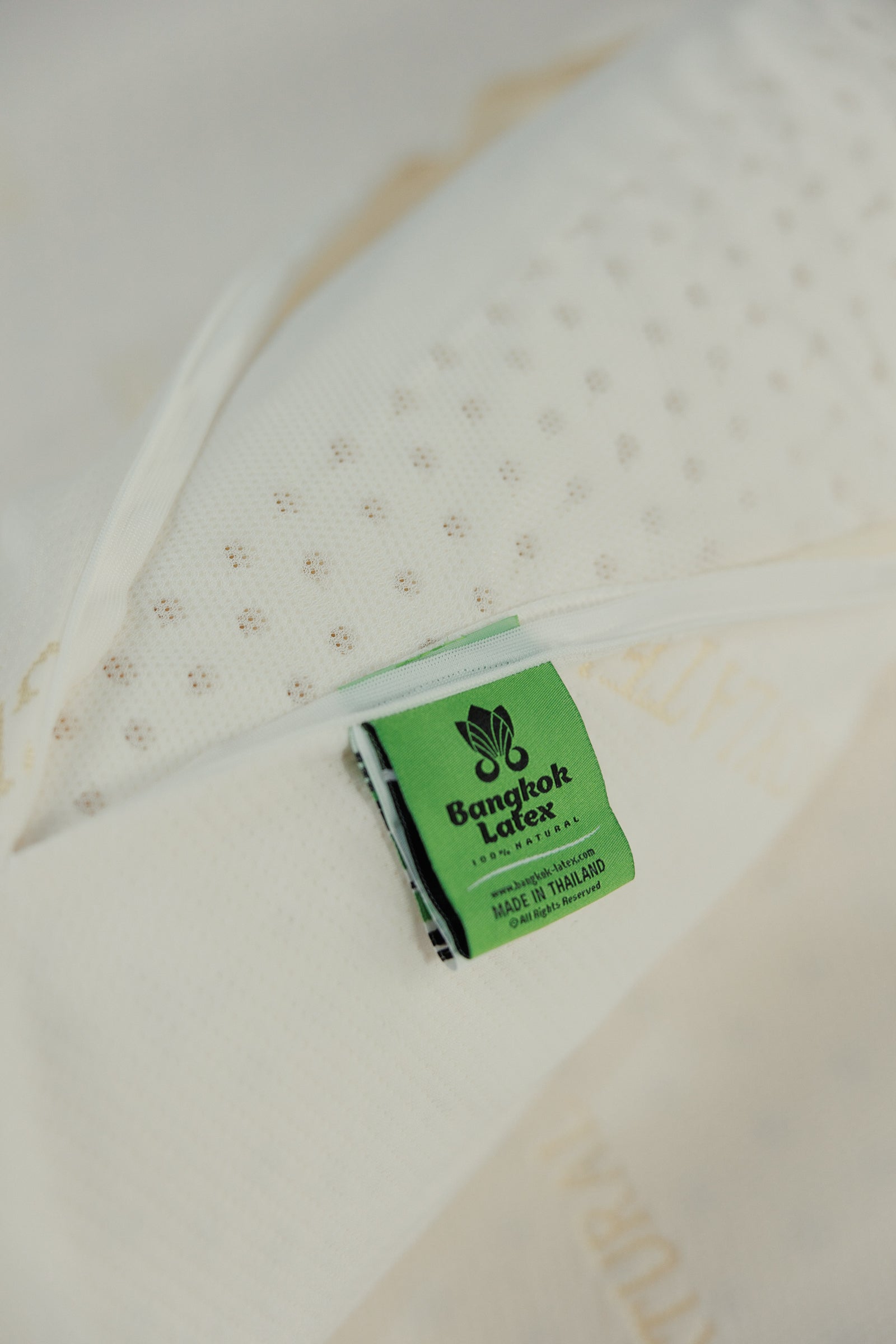 - Latex bolster filler, inner mesh pillowcase, and a branded soft pillowcase with a hidden zipper.