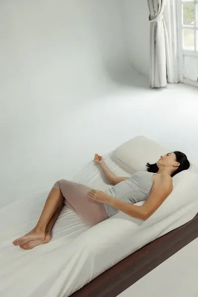 - For side-sleepers, placing one leg over the bolster can help alleviate pressure from the tailbone and lower back, promoting a more relaxed and restful sleep.