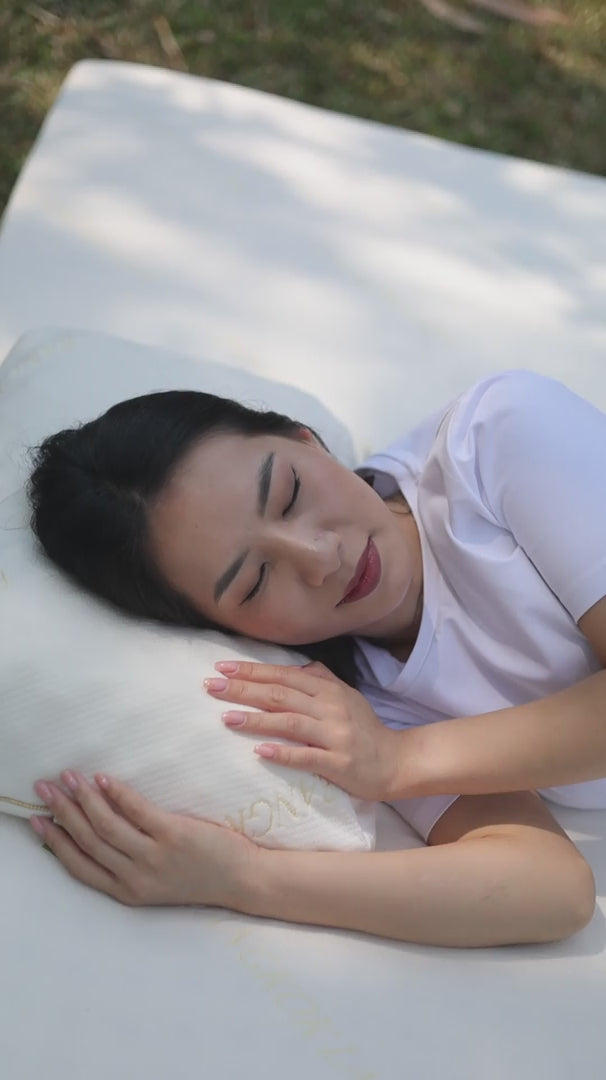 - ตรงกลางหมอนจะนุ่มขึ้นและมีระดับต่ำลงประมาณ 5-6 ซม.หลังจากนอนลง สามารถรองรับศีรษะและคอของ